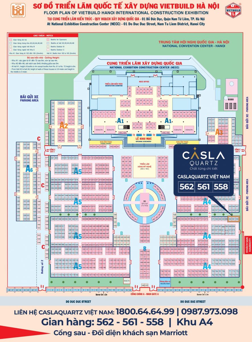Chúng tôi hân hạnh đón tiếp các Tổ chức, Doanh nghiệp, Cá nhân đến với triển lãm VietBuild nói chung cũng như tham quan Gian hàng CASLAQUARTZ tại vị trí: 558 - 561 - 562 khu A4 (hướng dẫn Sơ đồ bên dưới):