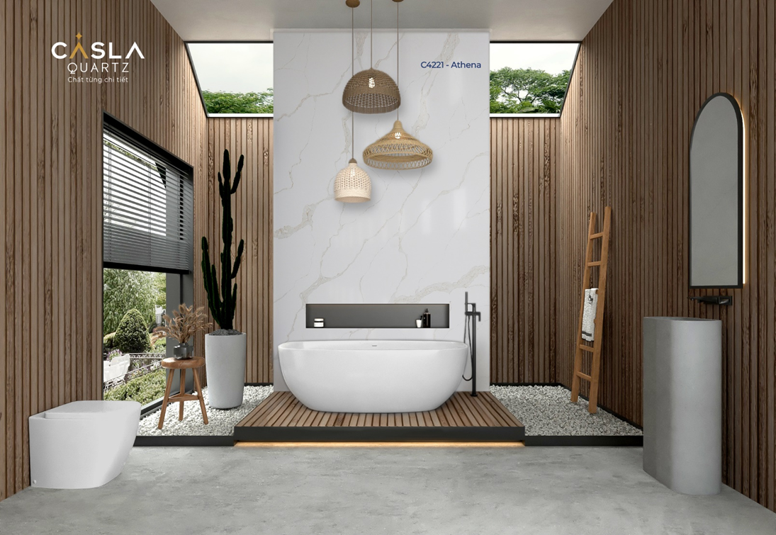 Đá thạch anh nhân tạo Caslaquartz làm nổi bật không gian phòng tắm sang trọng