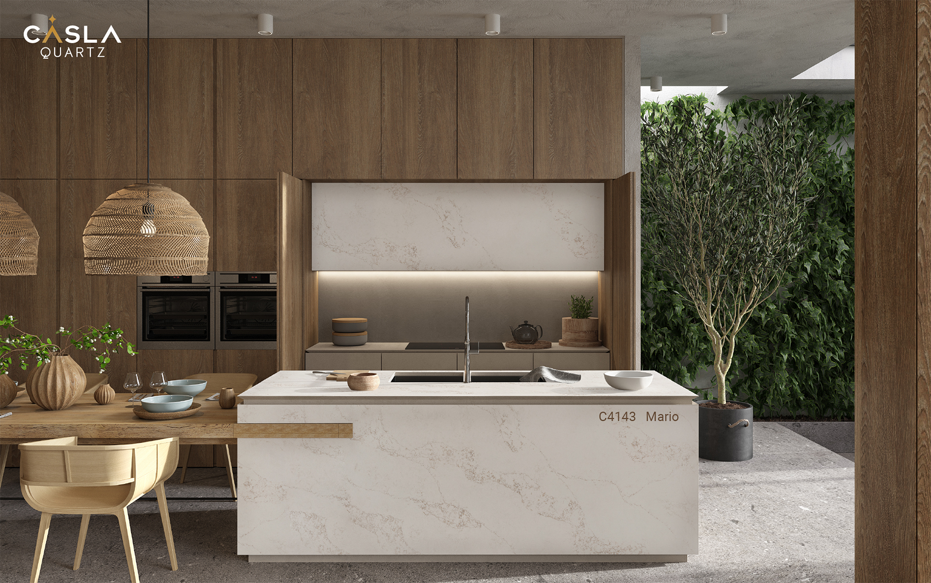 Cùng với đá ốp, gỗ tự nhiên đã được con người sử dụng trong trang trí nội thất từ rất lâu đời và được ưa chuộng cho đến ngày nay. Đá thạch anh nhân tạo với bề mặt tinh xảo, vân đá sống động, khi kết hợp cùng gỗ sẽ tạo nên không gian cân bằng giữa sự sang trọng hiện đại và nét ấm cúng mộc mạc.